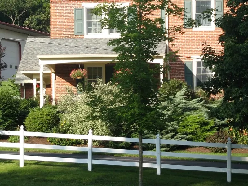 ● Lakótelepi tájkerítés: A fehér PVC oszlopok vízszintes sínekkel és növényzettel kombinálva klasszikus angol vagy amerikai birtok-stílusú határvonalat alkotnak.