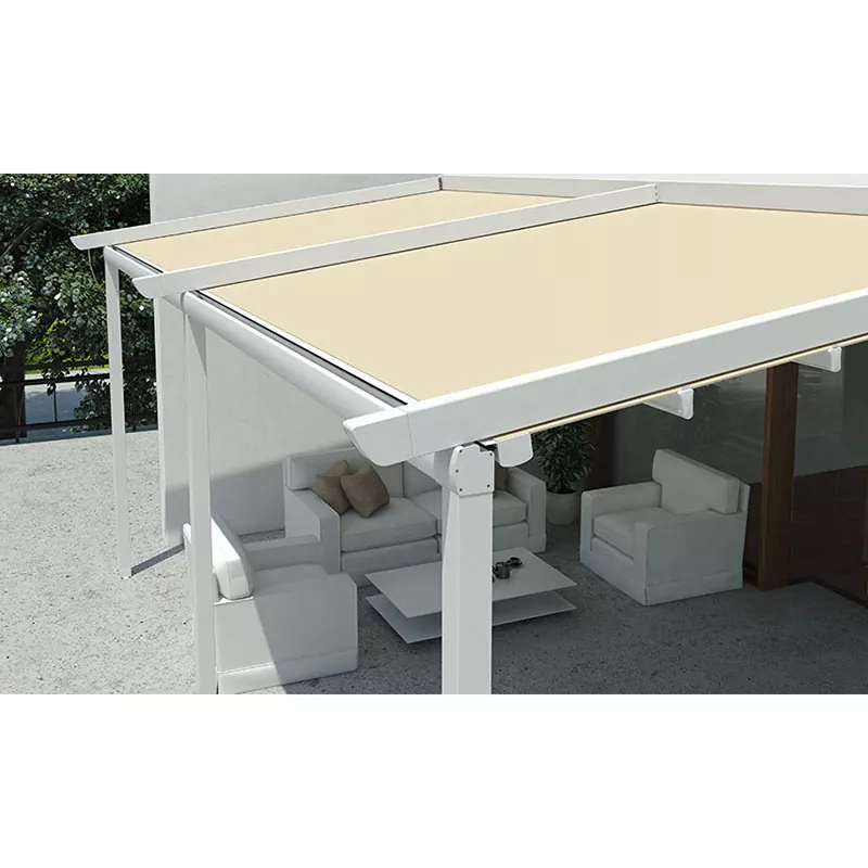Elektromos behúzható pergola, amelyet kizárólag a Vionta tervezett, hogy nagy teljesítményt és tartósságot biztosítson. 120 x 70 mm-es vezetőprofillal és PVC burkolattal akár 6 méteres vetítési hosszt biztosít, kényelmesen lefedve nagy területeket.