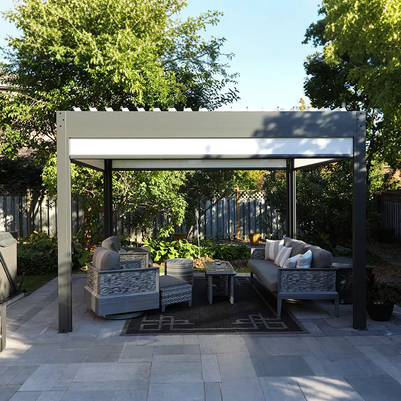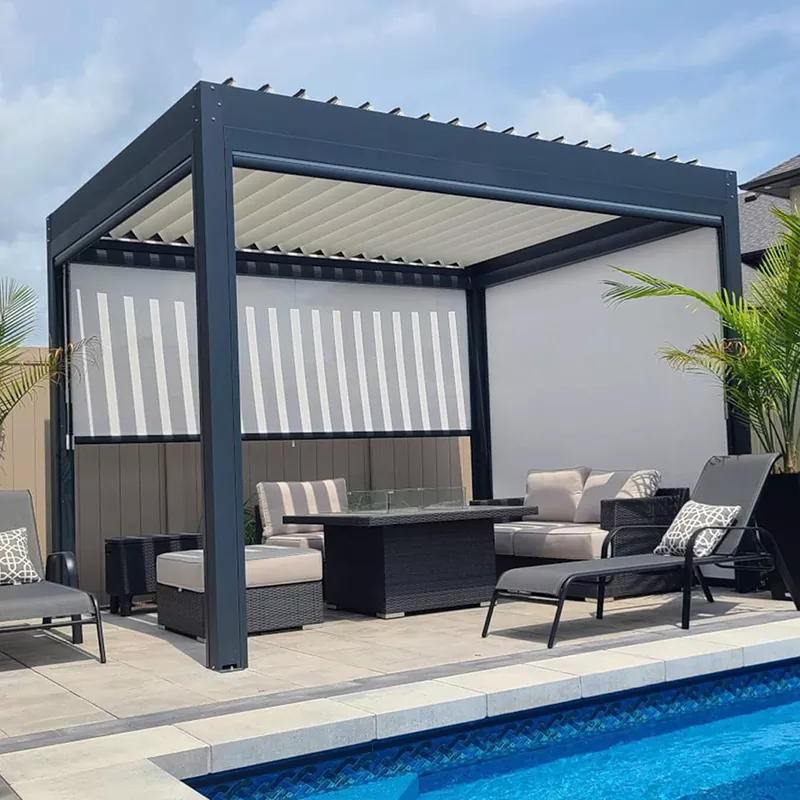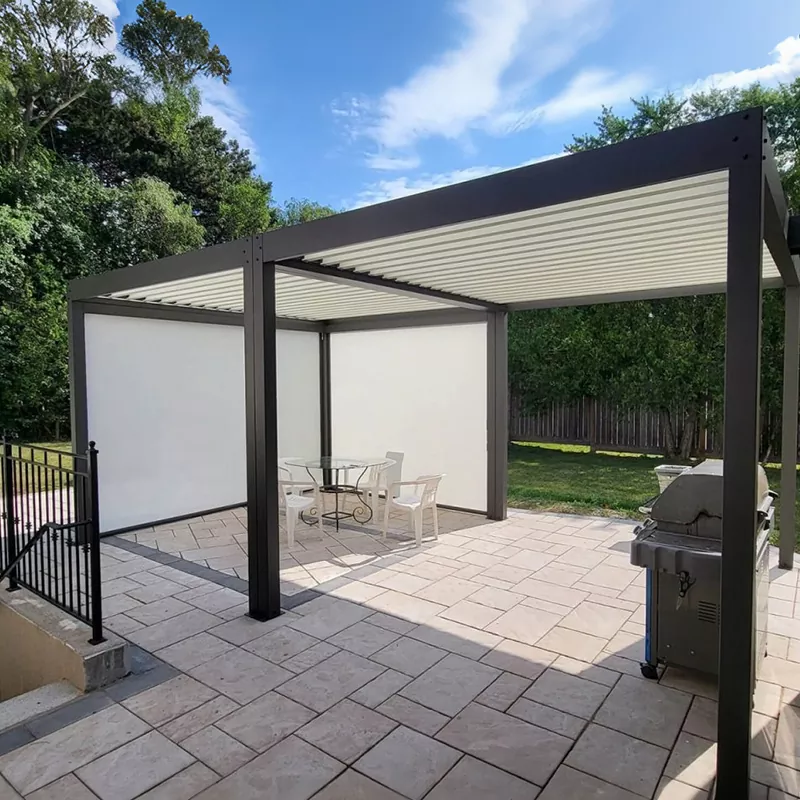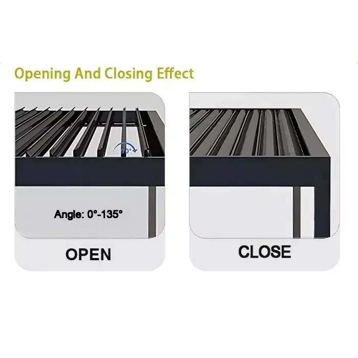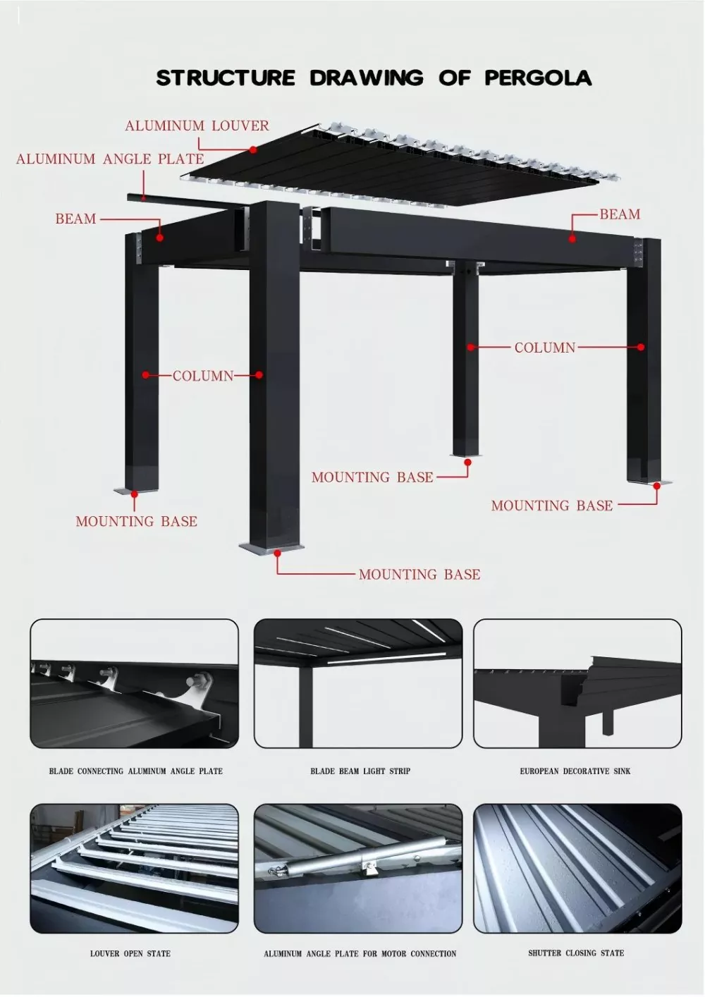 ● Integrált rendszer: A csúcskategóriás modellek jellemzően beépített rejtett vízelvezető csatornákkal és elterelő rendszerekkel rendelkeznek; Ez azt jelenti, hogy amikor a zsaluk zárt állapotban vannak, az egész szerkezet vízálló tetőként működhet, és az esővizet az oszlopok belsején keresztül vezeti el a vízelvezetéshez.