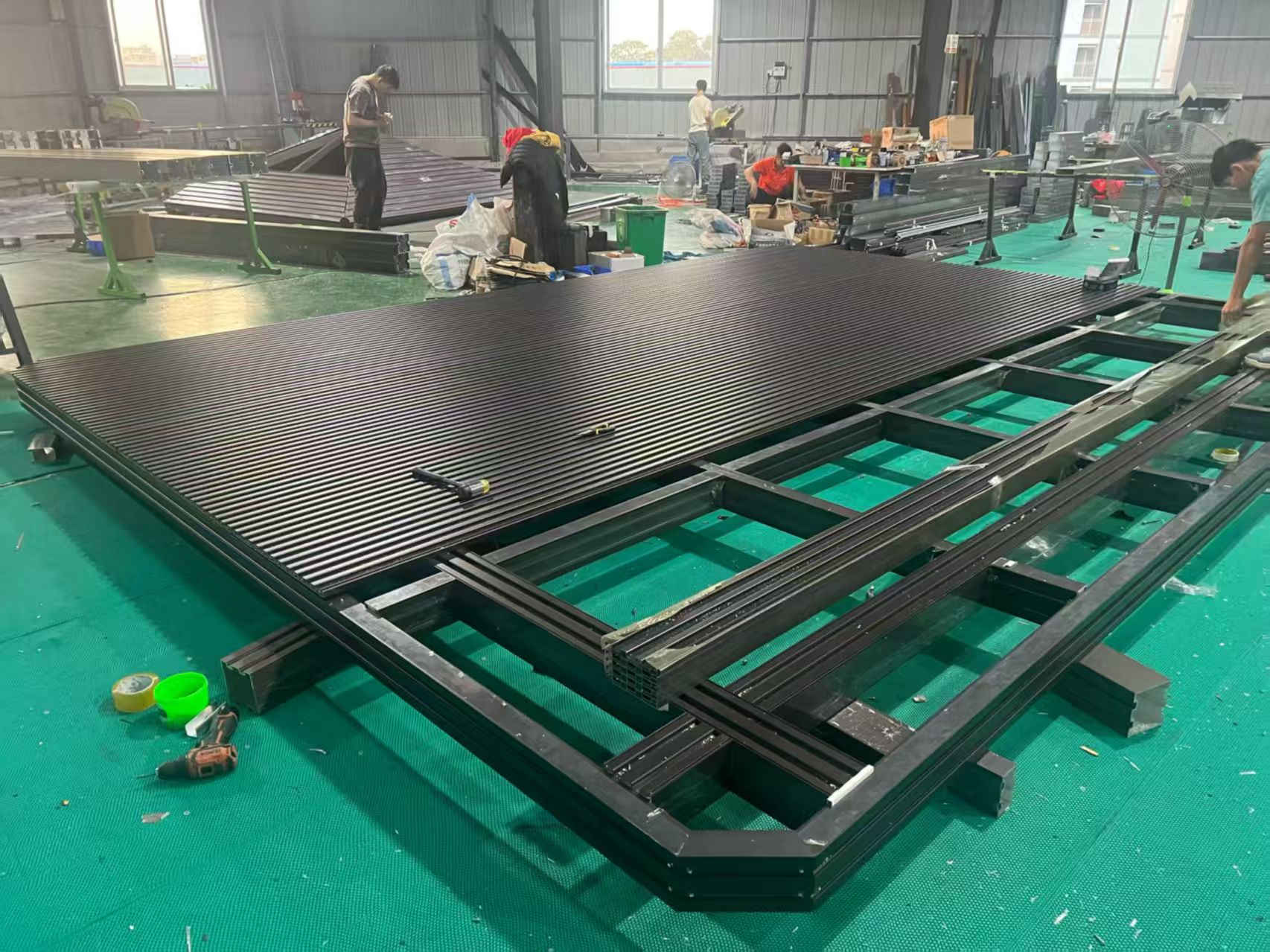 Az alumínium profilok porszórt felülettel vannak előkészítve, így tiszta megjelenést kölcsönöznek nekik, miközben javítják a kültéri tartósságot is. A keret rögzítése után a zsalupaneleket egyenként helyezik el. A munkások menet közben ellenőrzik a távolságot, az egyenességet és az illeszkedést, és nem várnak a végéig. Ez egy egyszerű folyamat, de a részletekre való odafigyelés a későbbiekben sokkal gördülékenyebbé teszi a telepítést.