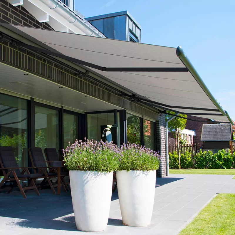 A napellenző szövetének, karjainak és mechanizmusainak részleges burkolatát biztosító félkazettás napellenzők tökéletesek a védettebb kertek és teraszok számára.